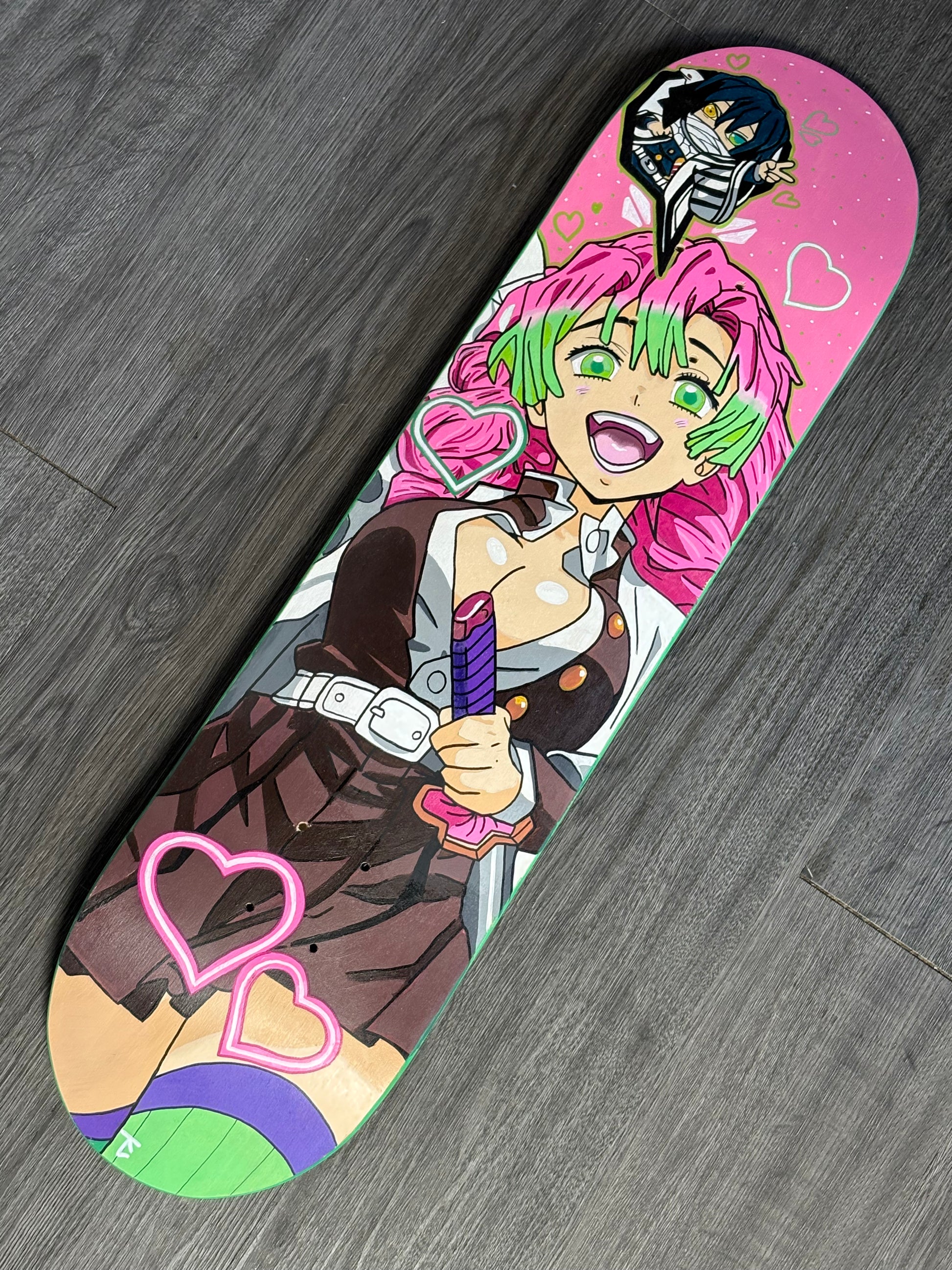 Bring the vibrant spirit of Demon Slayer into your space with this hand-painted Love Hashira skate deck. Featuring Mitsuri Kanroji’s iconic charm, this unique wall art adds a playful pop of color and personality to any room. Perfect for fans who want to showcase their love for the series in a fun and creative way.